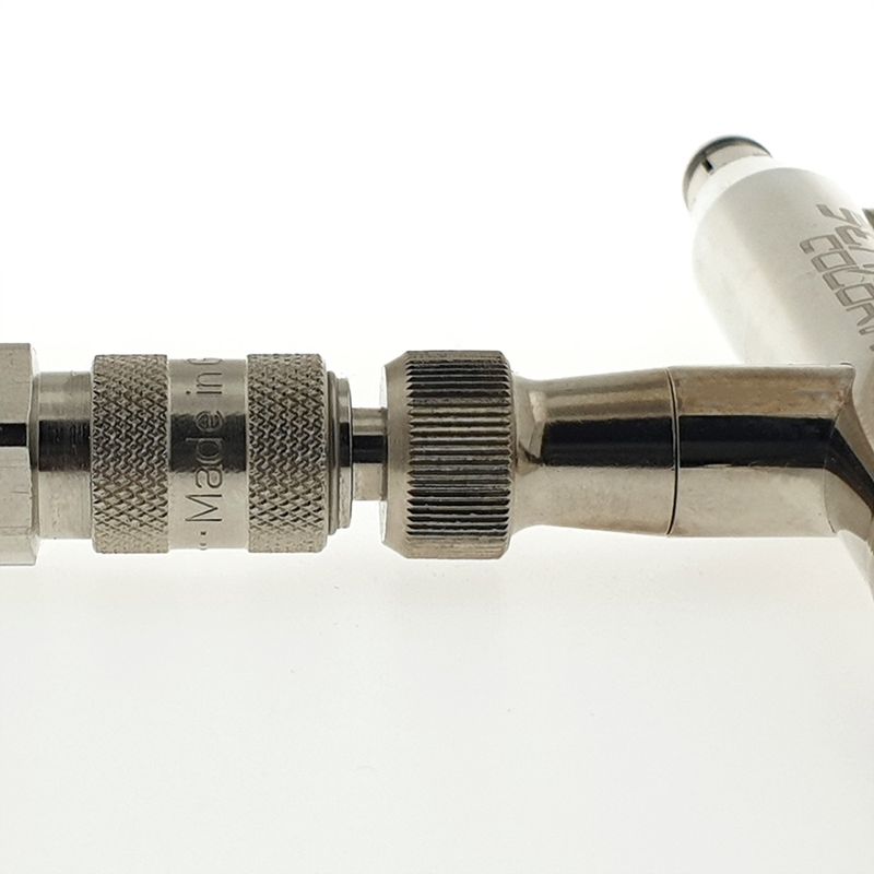 Connects the hose to the airbrush and also offers an integrated fine pressure regulator!