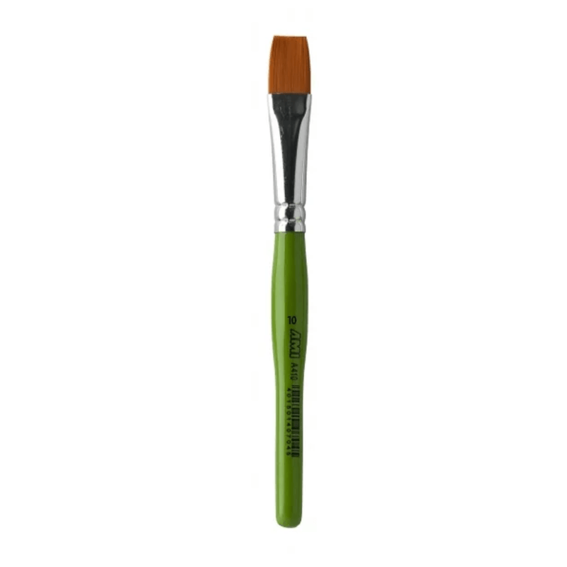 Juniorpinsel Serie A410, Gr. 10 Flacher Pinsel mit goldfarbenem Synthetikhaar in einer nahtlosen, silberfarbenen Zwinge, mit kurzem, neon-grün lackiertem Stiel.