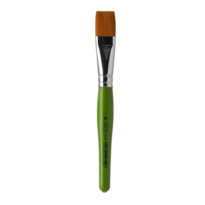 Juniorpinsel Serie A410, Gr. 14 Flacher Pinsel mit goldfarbenem Synthetikhaar in einer nahtlosen, silberfarbenen Zwinge, mit kurzem, neon-grün lackiertem Stiel.