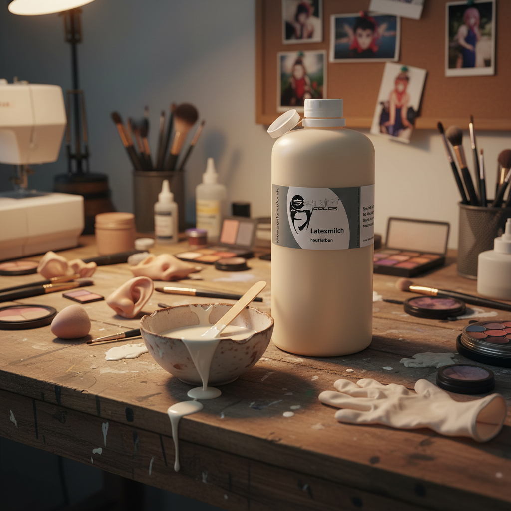 Skin colored latex milk, water soluble, dries waterproof in thin layers, for 3D SFX MakeUp special effects.